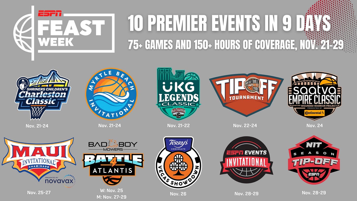 Meanwhile, on the men’s side, Feast Week has begun! This is one of my favorite times in the season because of all the mini tournaments creating great matchups you don’t get to see on the schedule as often. Obviously, Feast Week is a double meaning here as it mainly refers to Thanksgiving, but also because there is just a buffet of delicious snacks on the schedule all week that we just get to gobble up. Here are some of the highlights to circle on calendar.