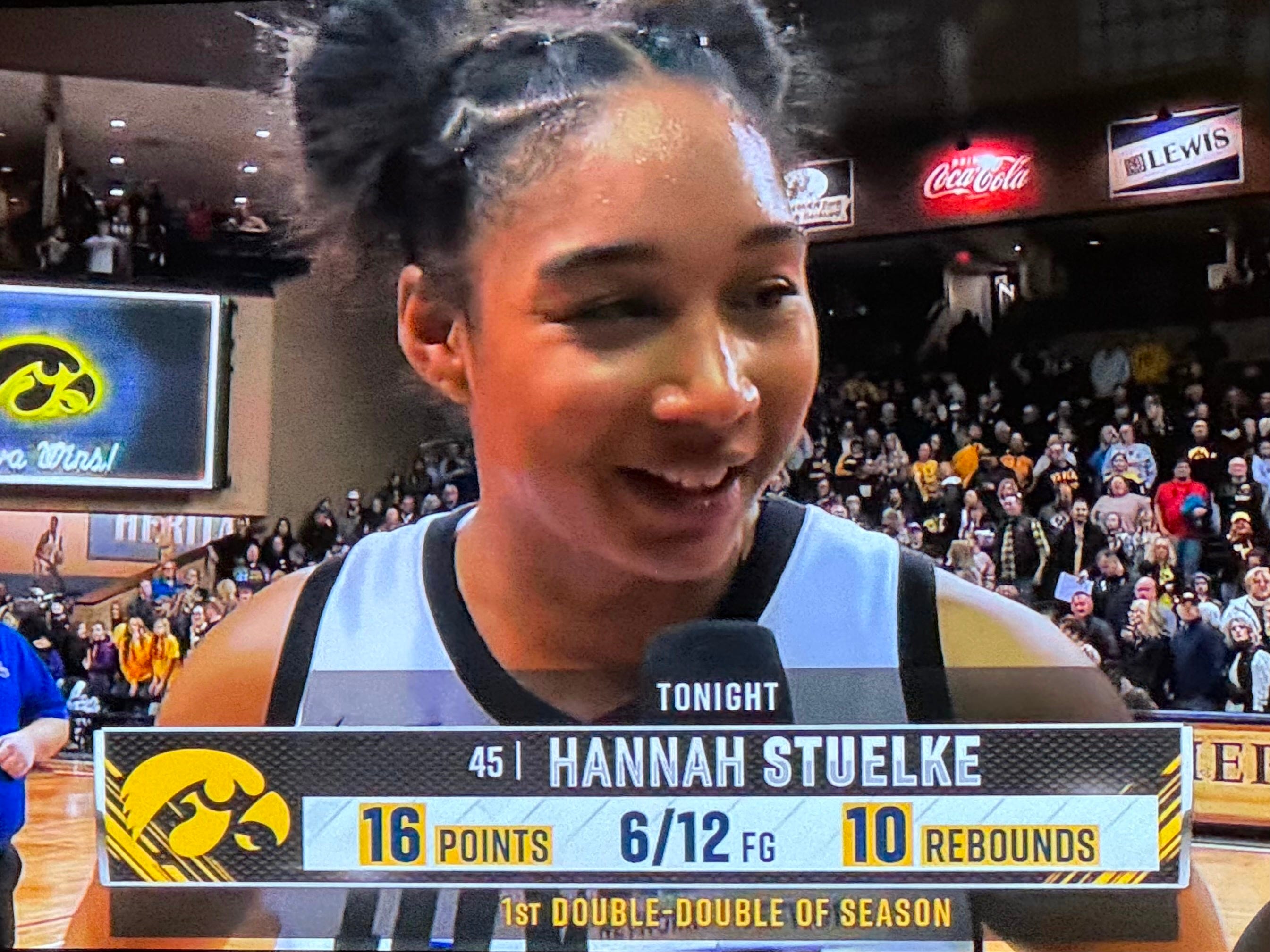 This has been a challenging start of the season for ‘Hometown Hannah’. Not a bad start. Just a challenging one. She is coming off a knee injury that kept her from practice until late September. She has a new head coach (granted Jan Jensen was the associate head coach for 24 years previous). She has a new point guard running the floor (Lucy Olsen) with a different style from the previous one (Caitlin Clark). And, she is playing a new position (the 4) and not the 5 we have all got accustomed to. Bottom line - this is different looking Hannah Stuelke than we were watching previously. Sometimes she was locked in, and other times, she may have looked a little lost. But, Hannah is a fighter, so it would just be a matter of time for things to snap in place.