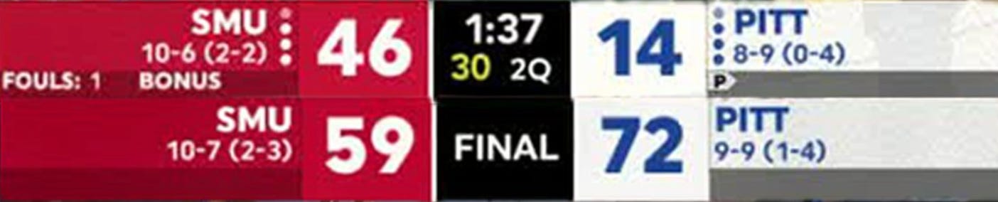 Lastly, we have a comeback story when SMU went to Pitt and built up an 32 point lead in the first half only to lose by 13, tying an NCAA record! Congrats Coach Verdi and the Pittsburgh Panthers!