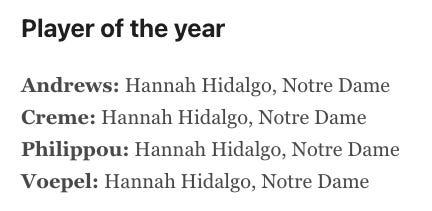 Most importantly, this put Hannah right up front and center. One reason I wanted to write this segment was because she was in the shadows of other classmates (like Juju Watkins, Audi Crooks, Madison Booker, etc) and other stars like Paige Bueckers. All great players in their own right. I didn’t know Hannah until I saw Notre Dame play Louisville last season.