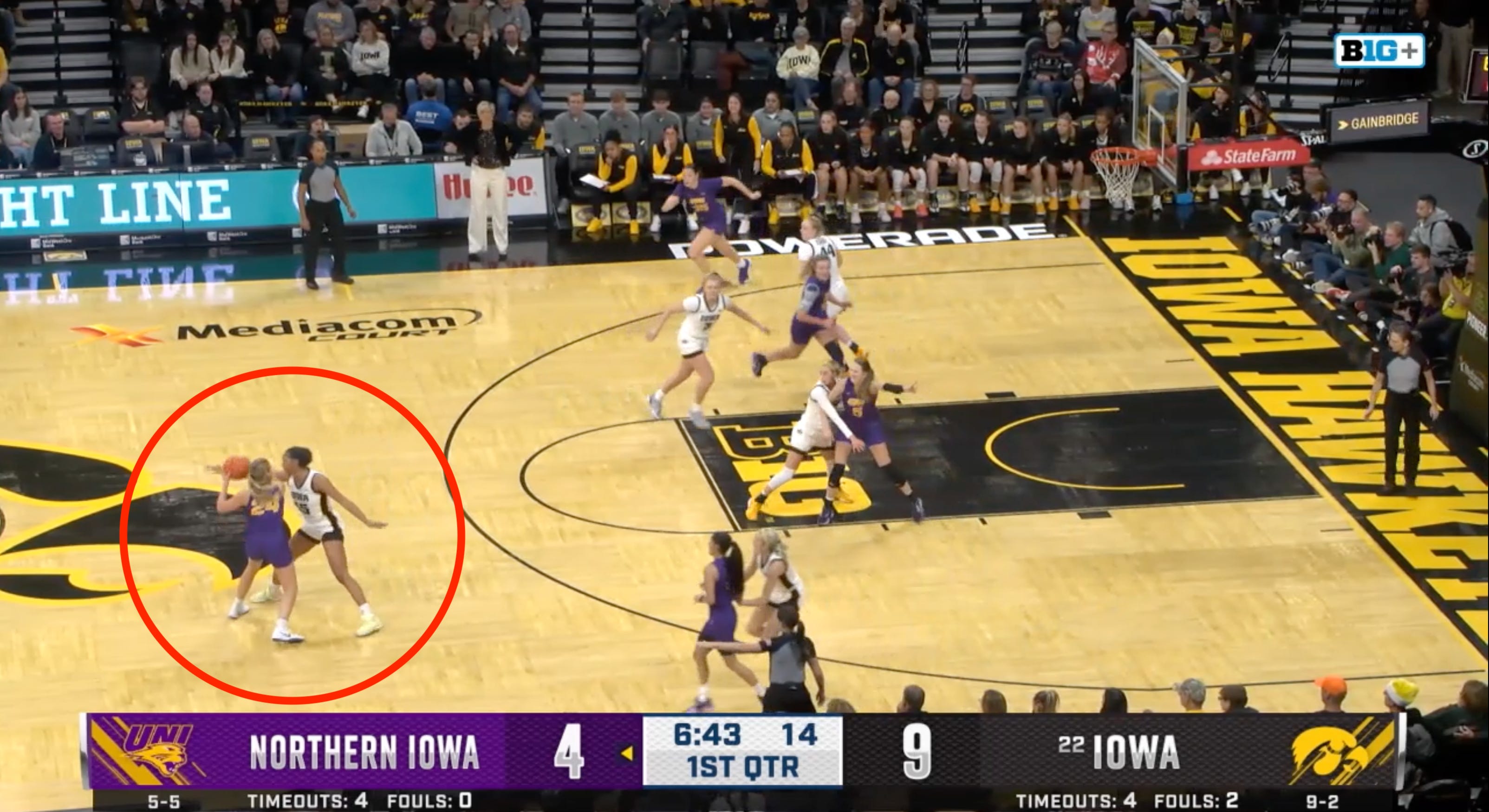 While she has been going back down low when needed on offense, on defense she was coming far up to make life uncomfortable for UNI ball handlers, even playing a little Hannah Hidalgo-style D. Love it.