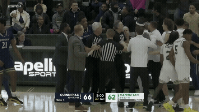 Quinnipiac’s Tom Pecora charged at Manhattan’s John Gallagher after a hard foul was committed on one of his players. Gallagher said something that teed off Pecora and the refs had to get in the middle. Pecora said no one from his team went to check on his player after going down, so he had to say something. He also clearly forgot that Manhattan College is actually in Da Boogie Down Bronx so he should watch his step.