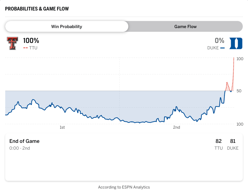 First, the men’s team taking down #3 Duke 82-81. Duke led from the start until the 1:13 mark in the second when The Red Raiders got their first lead. But it was the Christian Anderson’s game winning free throws with 3.4 seconds left to steal it.