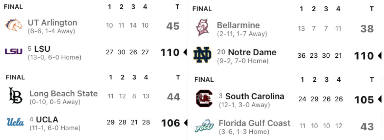 On the Women’s side, its even worse - of the 19 Top-25 games, 10 of them ended in blowouts, including 6 of those being by 50 or more. That is literally 60% of the all the ‘blowouts’ (30pts or more) are by 50. The worst being the 82-point victory for #20 Notre Dame over Bellarmine.